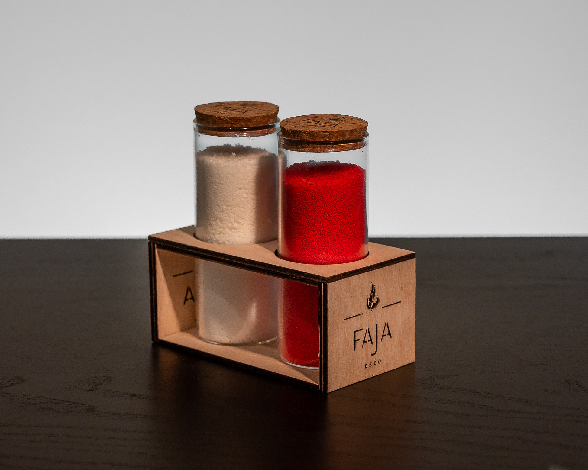 Kurkite šiltą ir jaukią atmosferą su FAJA DECO augalinio vaško miltelių žvakėmis stiklinėse kolbelėse, kartu su elegantiškais mediniais stoveliais.