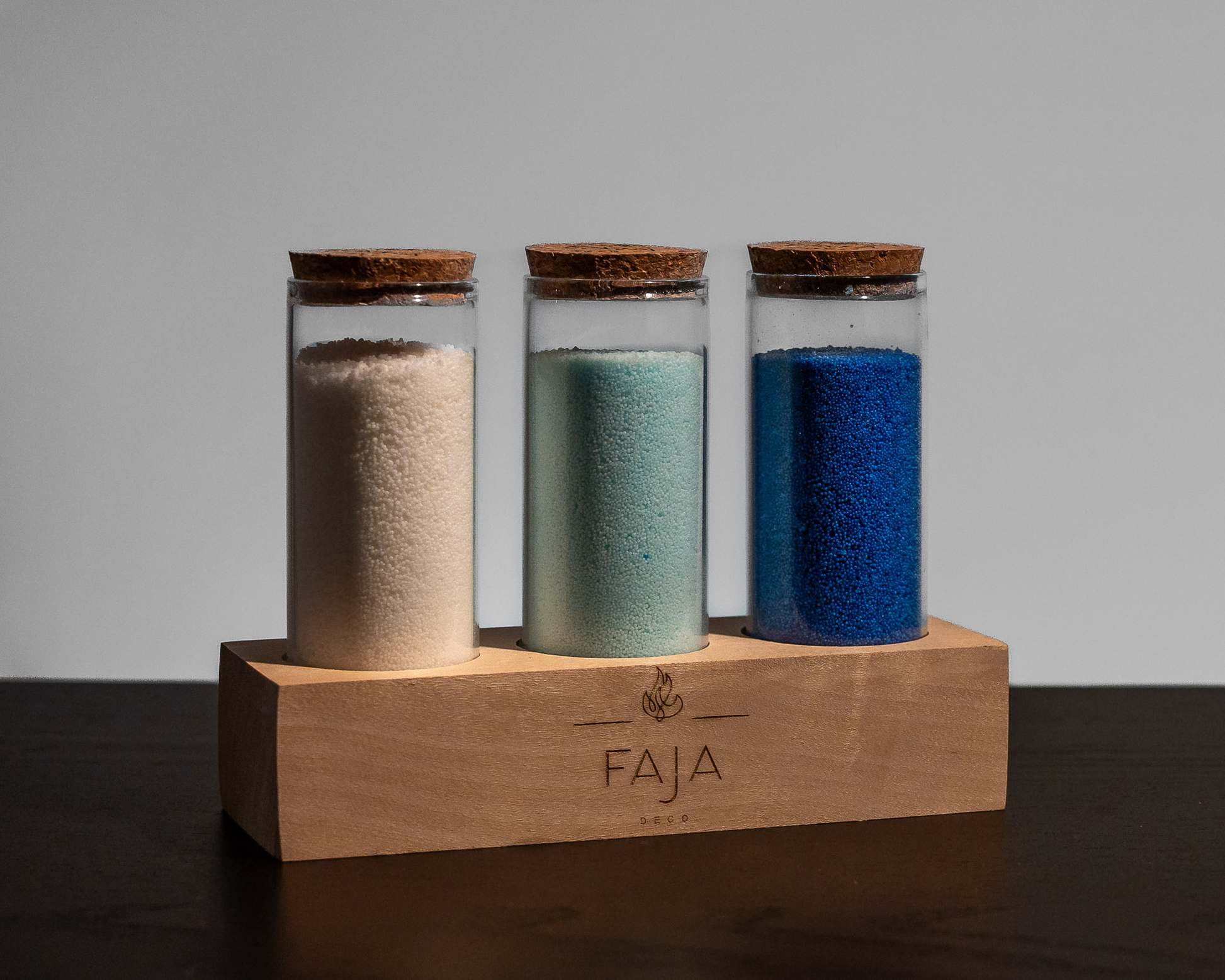 Kurkite šiltą ir jaukią atmosferą su FAJA DECO augalinio vaško miltelių žvakėmis stiklinėse kolbelėse, kartu su elegantiškais mediniais stoveliais.