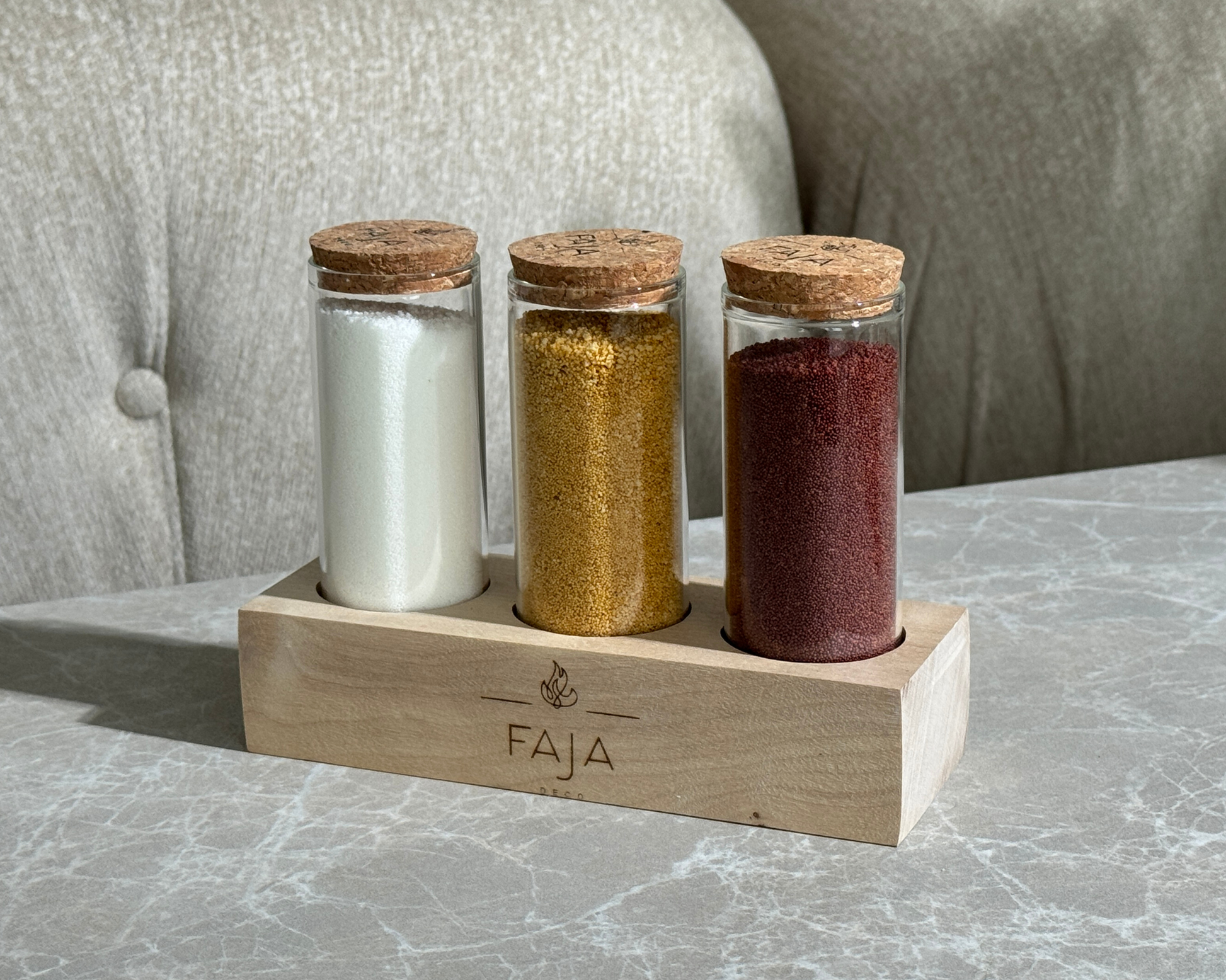 Kurkite šiltą ir jaukią atmosferą su FAJA DECO augalinio vaško miltelių žvakėmis stiklinėse kolbelėse, kartu su elegantiškais mediniais stoveliais.