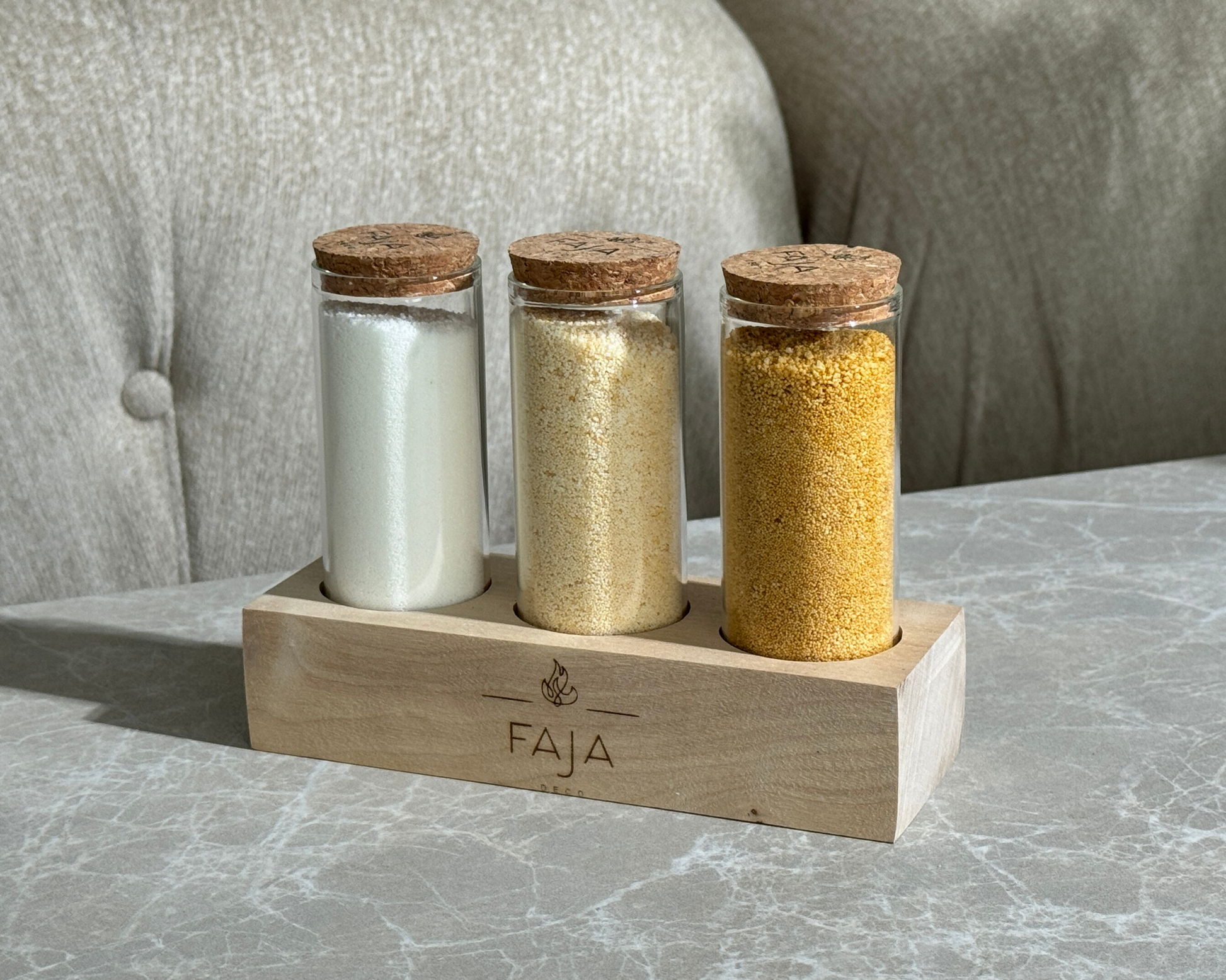 Kurkite šiltą ir jaukią atmosferą su FAJA DECO augalinio vaško miltelių žvakėmis stiklinėse kolbelėse, kartu su elegantiškais mediniais stoveliais.